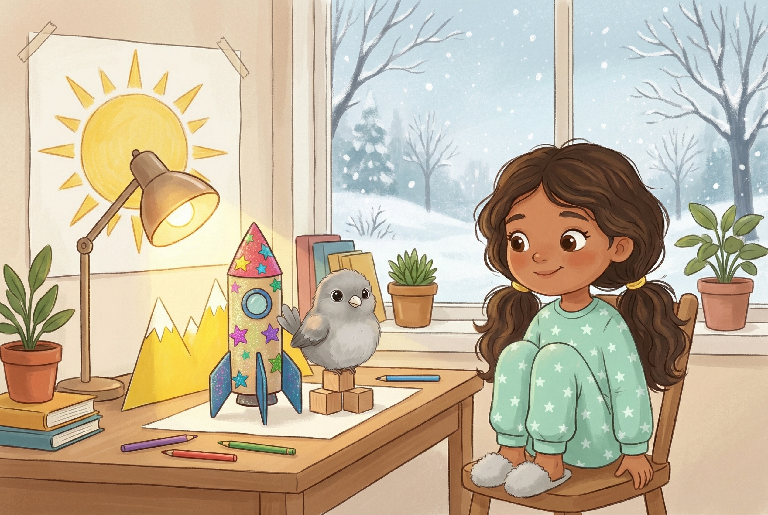 A fluffy bird escapes winter by flying to a cozy window garden, learning bravery and friendship as she finds warmth, snacks, and a safe new home.