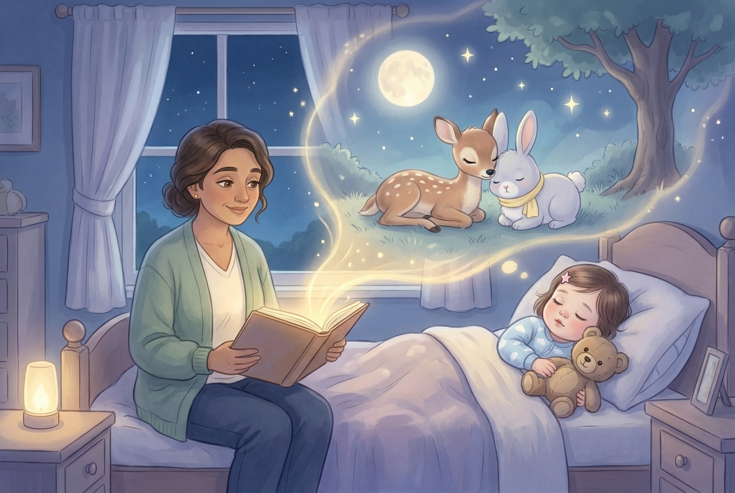 Suzy follows a calm bedtime routine—dinner, bath, teeth, PJs, and a forest story—then drifts to sleep with Mom’s gentle touch.