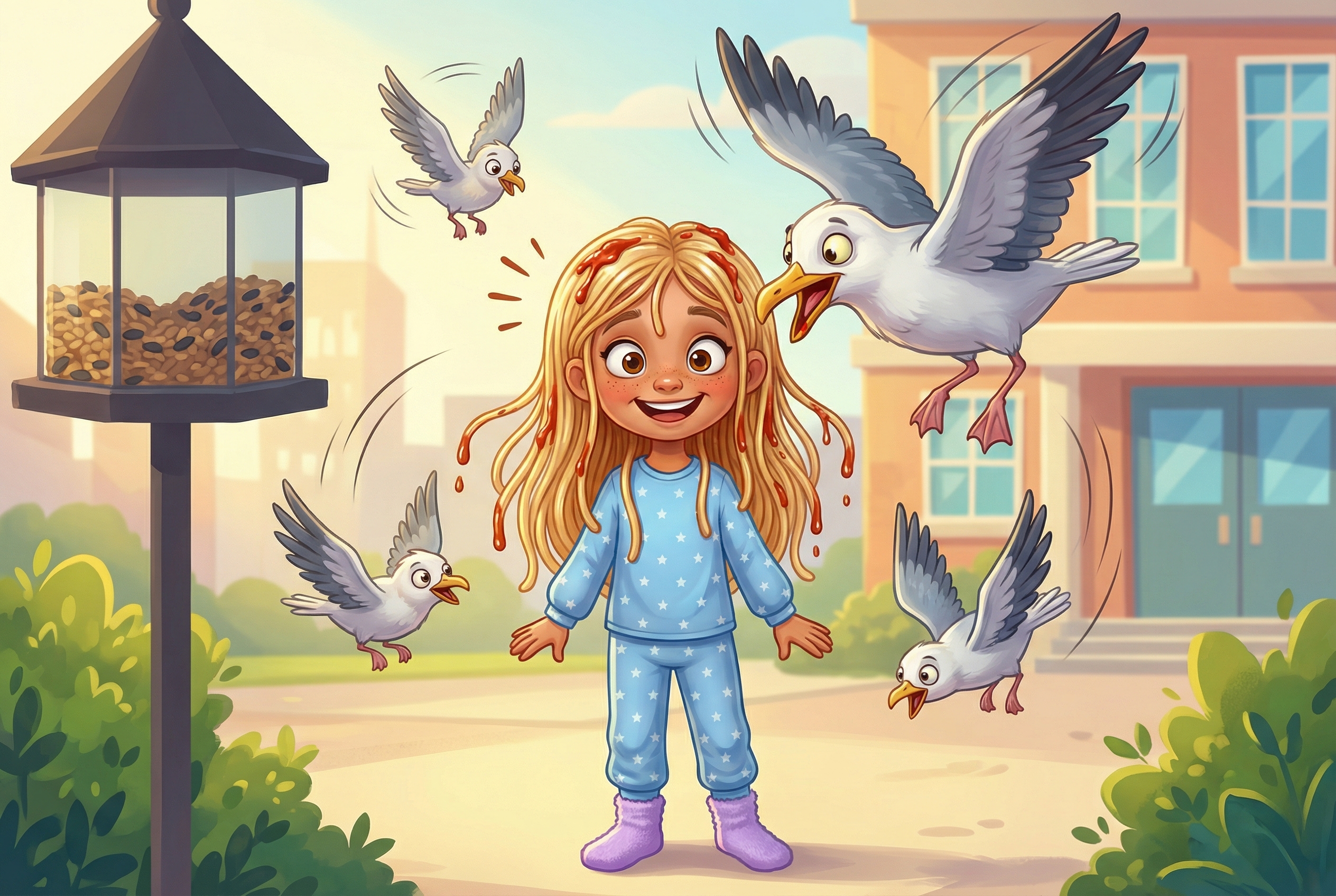 A girl's wish to skip hair-brushing backfires hilariously when she wakes up with spaghetti for hair and hungry birds won't leave her alone.