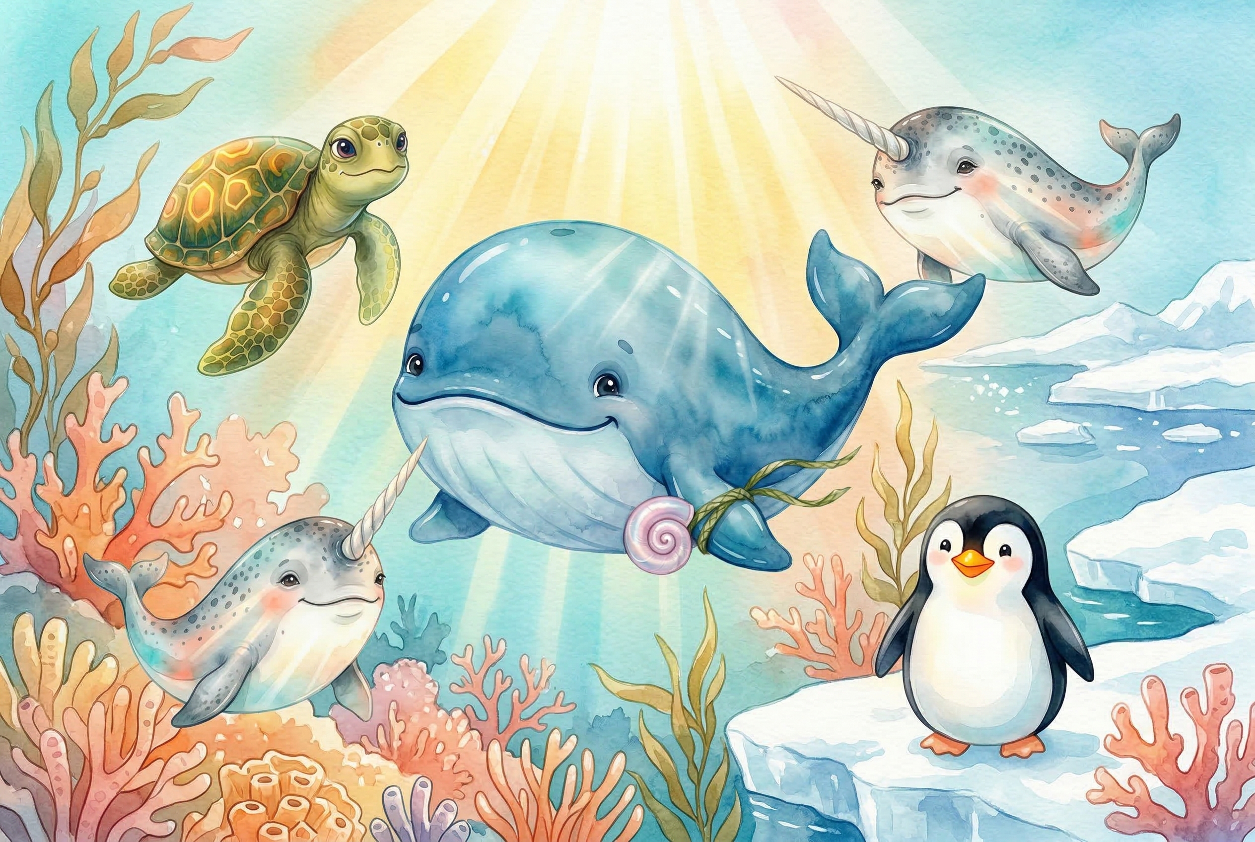 A cheerful whale swims around Earth to find a lost shell, exploring oceans, poles, and coral reefs while learning how to care for our planet.